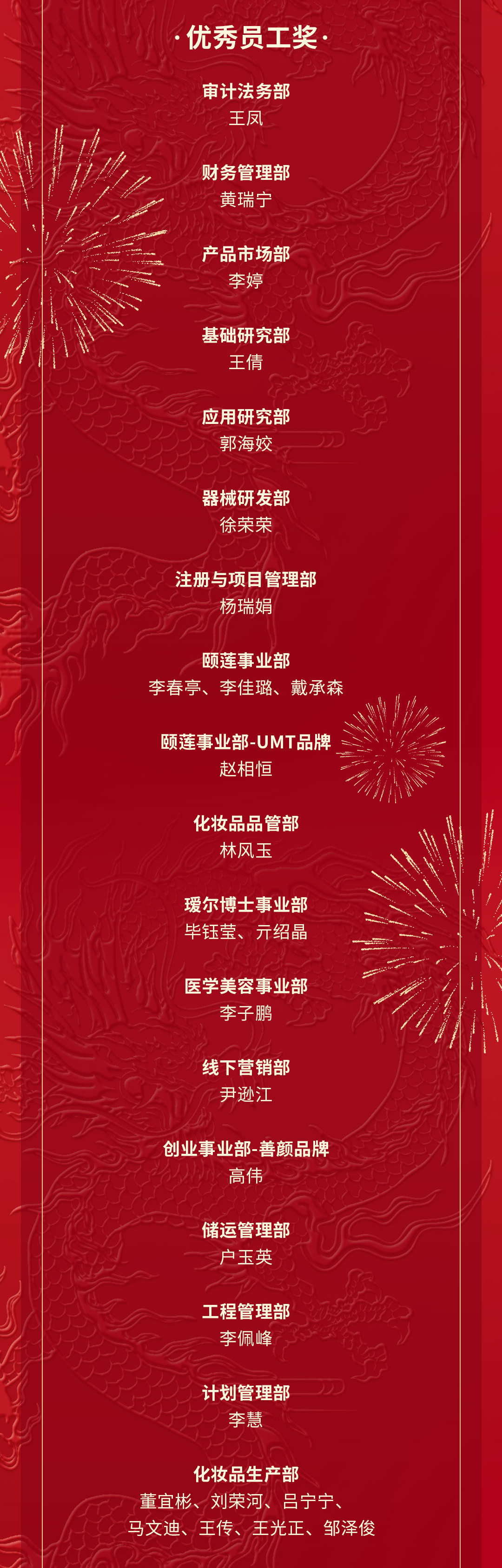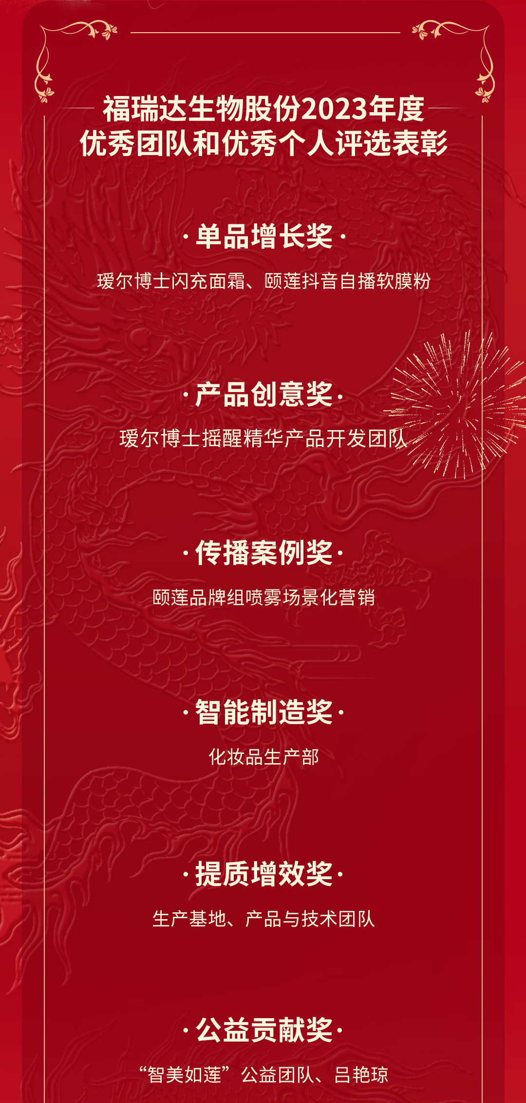 這一年,公司各部門涌現(xiàn)出一批充分發(fā)揮奮斗精神和主觀能動性干事創(chuàng)業(yè)的團隊和員工。人力資源部近日組織開展2023年度優(yōu)秀團隊和優(yōu)秀個人評選,共評出單品增長、產(chǎn)品創(chuàng)意、傳播案例獎、智能制造、提質(zhì)增效、公益貢獻六個團隊獎和優(yōu)秀員工、優(yōu)秀新人、突出管理、基層管理、公益貢獻五個個人獎。會上,對福瑞達生物股份2023年度優(yōu)秀團隊和優(yōu)秀個人進行了表彰。