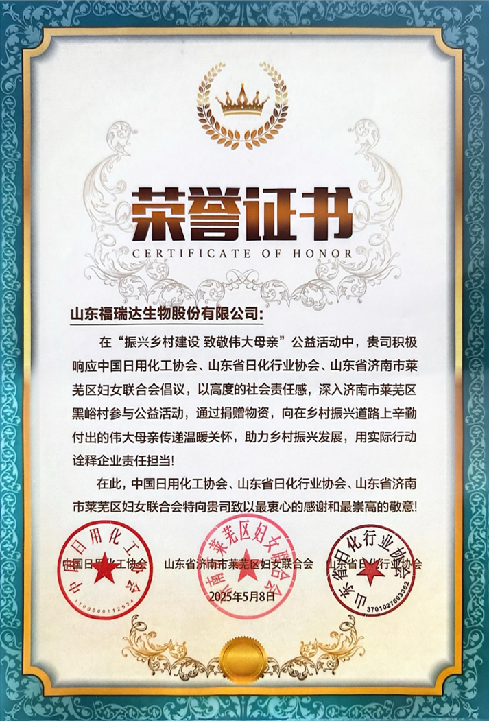 為積極響應國家鄉(xiāng)村振興戰(zhàn)略,弘揚中華民族孝敬母親的傳統(tǒng)美德。2025年5月8日,由中國日用化工協(xié)會、山東省日化行業(yè)協(xié)會、濟南市萊蕪區(qū)婦女聯(lián)合會共同發(fā)起的“振興鄉(xiāng)村建設,致敬偉大母親”公益活動在濟南市萊蕪區(qū)黑峪村舉行。福瑞達生物股份積極響應公益活動號召,在母親節(jié)前夕以愛之名致敬鄉(xiāng)村母親。