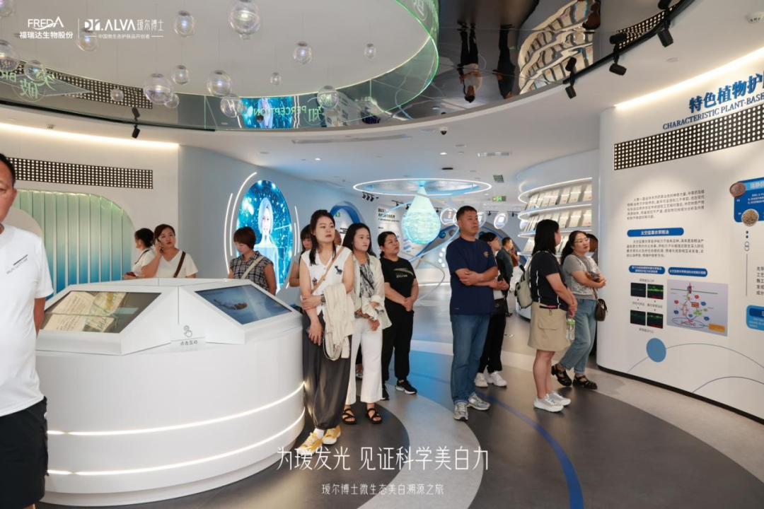 溯源之旅首站,客戶們走進(jìn)國(guó)內(nèi)首個(gè)美妝主題科技館 —— 福瑞達(dá)世界美妝科技館。一進(jìn)入展館,大家便被富有未來(lái)感的科技氛圍所吸引。借助工作人員的講解以及館內(nèi)的展品,大家深入了解了世界美妝的發(fā)展歷程,還有福瑞達(dá)為中國(guó)透明質(zhì)酸產(chǎn)業(yè)所作出的貢獻(xiàn)及取得的成果。此外,通過(guò)館內(nèi)趣味性十足的互動(dòng)裝置,大家切身感受到了璦爾博士品牌的科技力量。