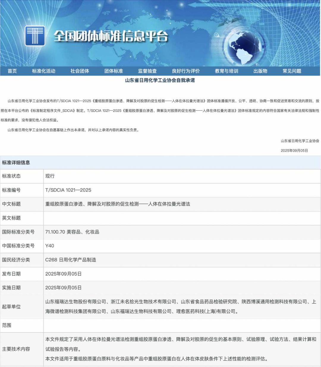 近日,由山東省日化行業(yè)協(xié)會(huì)歸口組織、山東福瑞達(dá)生物股份有限公司牽頭起草的《重組膠原蛋白滲透、降解及對(duì)膠原的促生檢測——人體在體拉曼光譜法》團(tuán)體標(biāo)準(zhǔn)正式發(fā)布實(shí)施,標(biāo)志著重組膠原蛋白皮膚滲透檢測有了新標(biāo)準(zhǔn)。